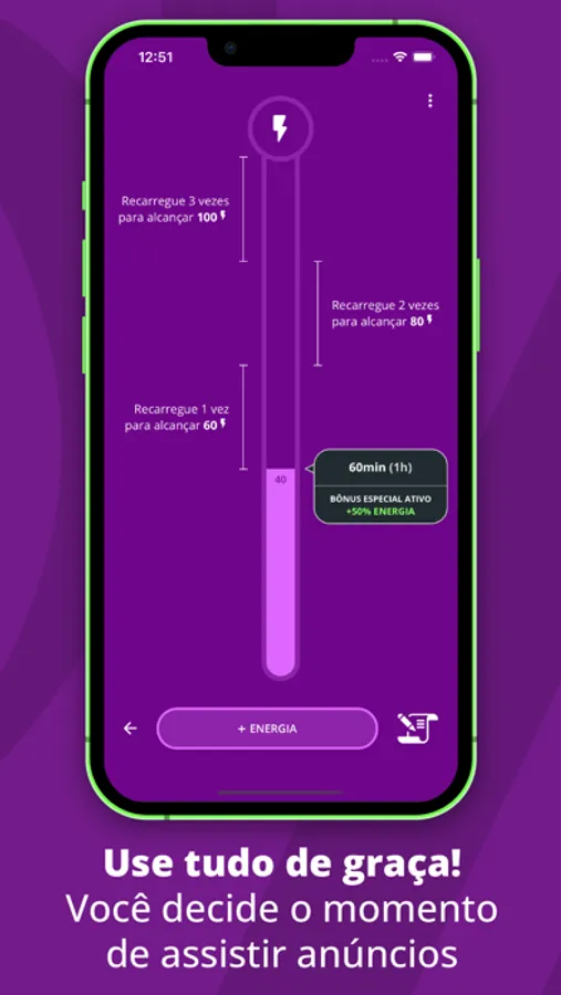 Aproveite todo o app sem qualquer restrição e sem anúncios invasivos e chatos. Criamos um sistema original - a Energia - para que Você decida o momento de ver anúncios e conquistar sua recompensa. Você ganha, na prática, acesso realmente gratuito a todo o app