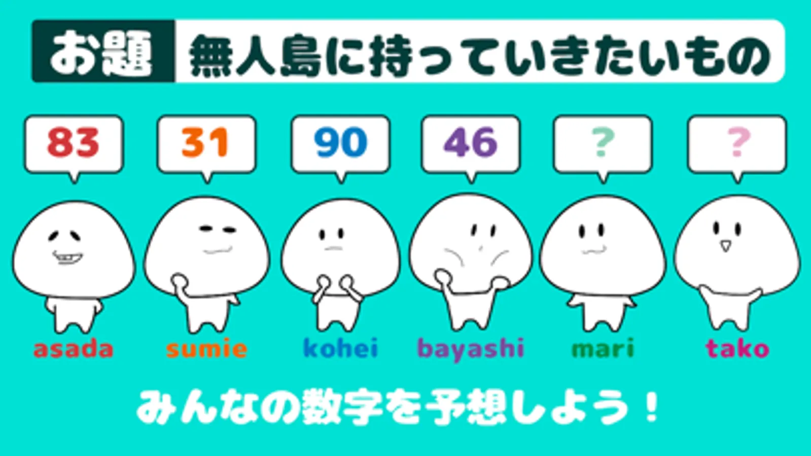 例えば、お題が【無人島に持っていくもの】、あなたの数字が【10】なら、【スマホ】