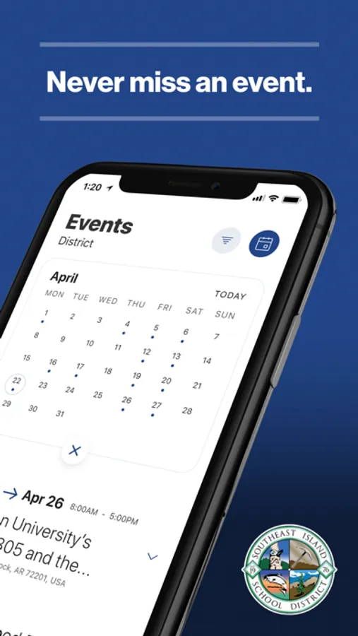The event section shows a list of events throughout the district. Users can add an event to your calendar to share the event with friends and family with one tap.