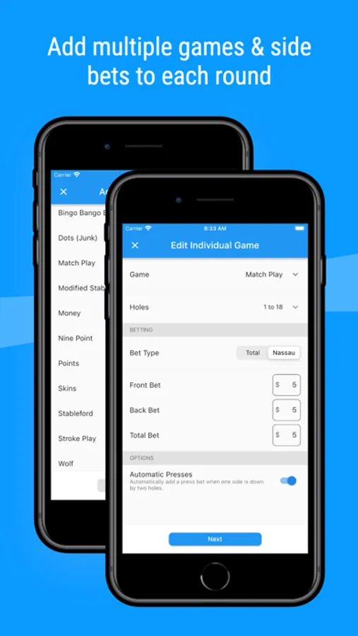 • Numerous games and formats including: Alternate Shot, Bank, Better Ball, Best Ball, Bingo Bango Bongo, Closeout, Dots (Junk), Las Vegas, Match Play, Modified Stableford, Money, Nassau, Nine Point, Points, Scramble, Scotch, Skins, Stableford, Stroke Play and Wolf.