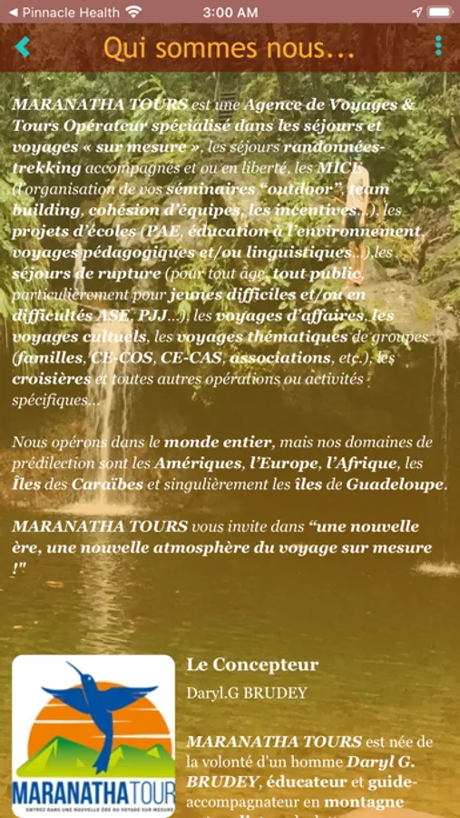 MARANATHA TOURS est une Agence de Voyages & Tours Opérateur spécialisé dans les séjours et voyages « sur mesure », les séjours randonnées-trekking accompagnés et ou en liberté, les MICE (l’organisation de vos séminaires “outdoor”, team building, cohésion d’équipes, les incentives…), les projets d’écoles (PAE, éducation à l’environnement, voyages pédagogiques et/ou linguistiques…),les séjours de rupture (pour tout âge, tout public, particulièrement pour jeunes difficiles et/ou en difficultés ASE, PJJ…), les voyages d’affaires, les voyages cultuels, les voyages thématiques de groupes (familles, CE-COS, CE-CAS, associations, etc.), les croisières et toutes autres opérations ou activités spécifiques…