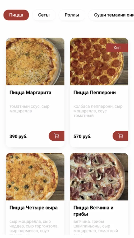Как сделать заказ в приложении “Ди Паоло”: выберите понравившиеся позиции из меню, добавьте их в корзину и перейдите на экран оформления заказа (по нажатию на иконку корзины).