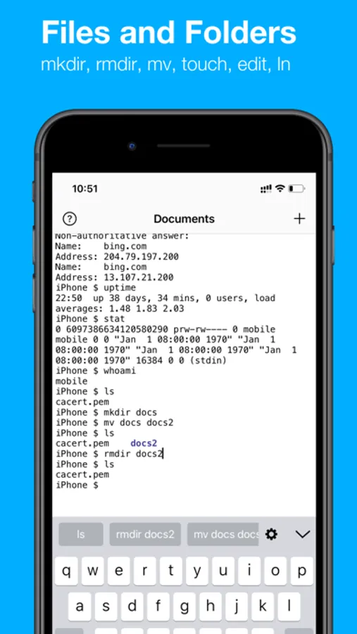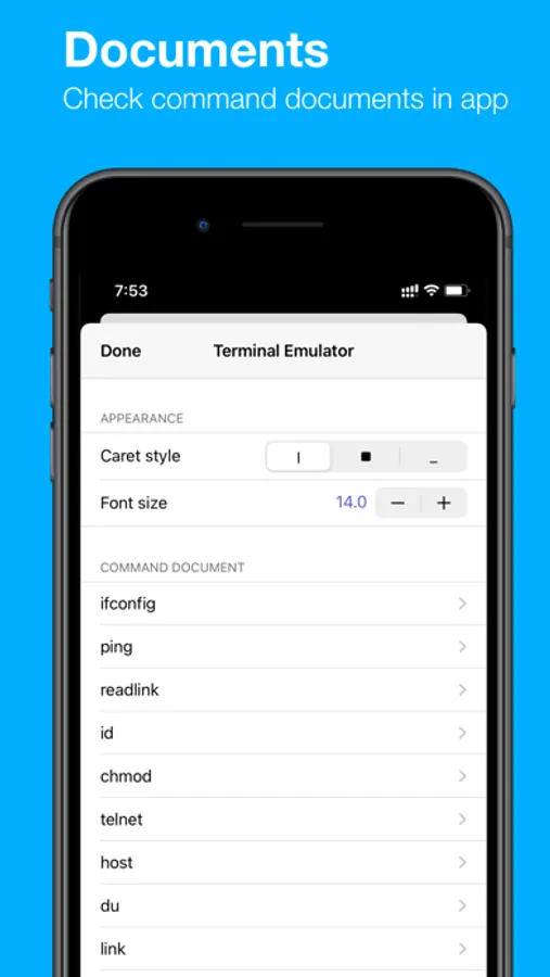 Terminal Emulator is a command line interface on iOS. Run Linux commands in sandbox and find command documents. Great way to start your Linux-like shell command journey.