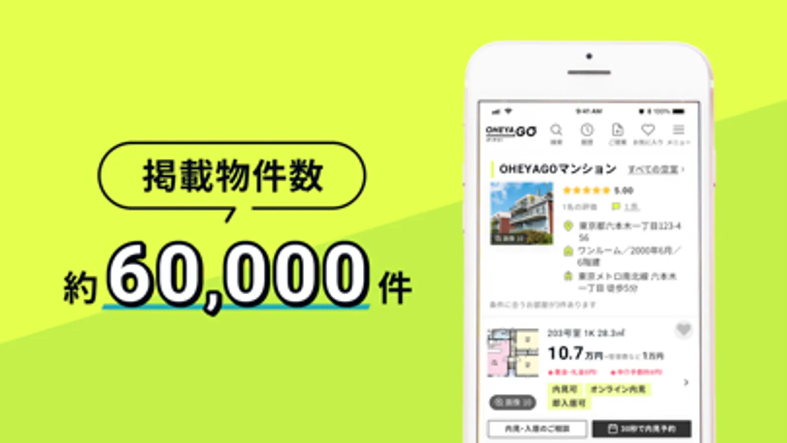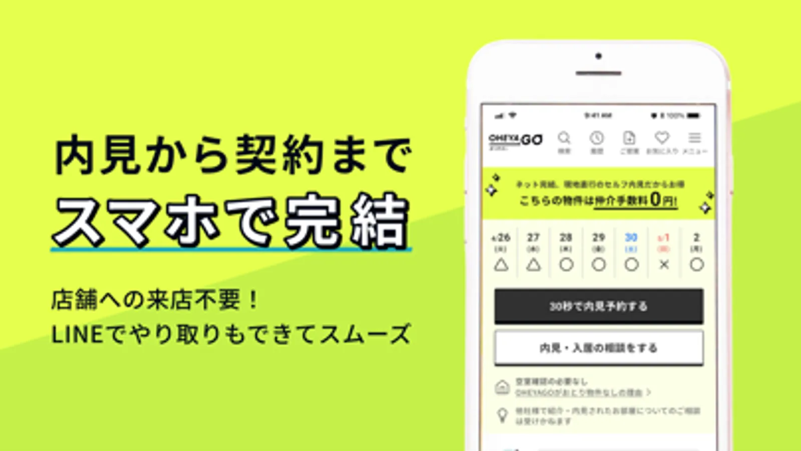OHEYAGOは、お部屋探し、内見予約、入居のお申し込み・契約までスマホ1つで完結する新しい形の不動産賃貸サービスです。