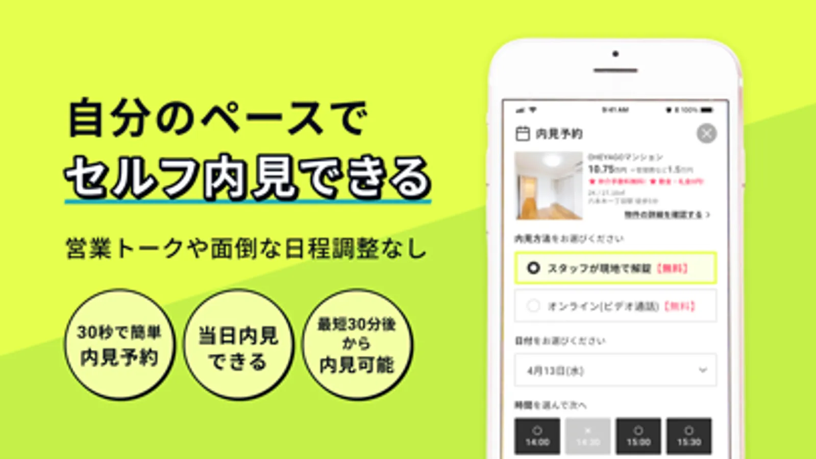日程調整の手間なく、カレンダーから簡単に内見予約ができます。