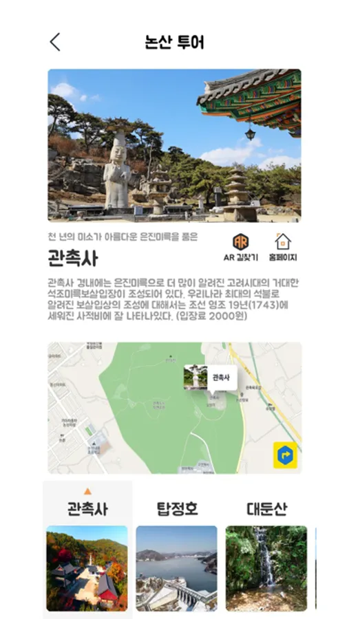 논산의 절경인 8경과 즐길거리가 많은 선샤인랜드를 방문해보세요. 가족, 친구, 연인과 함께 논산을 증강현실과 함께 여행해보세요.