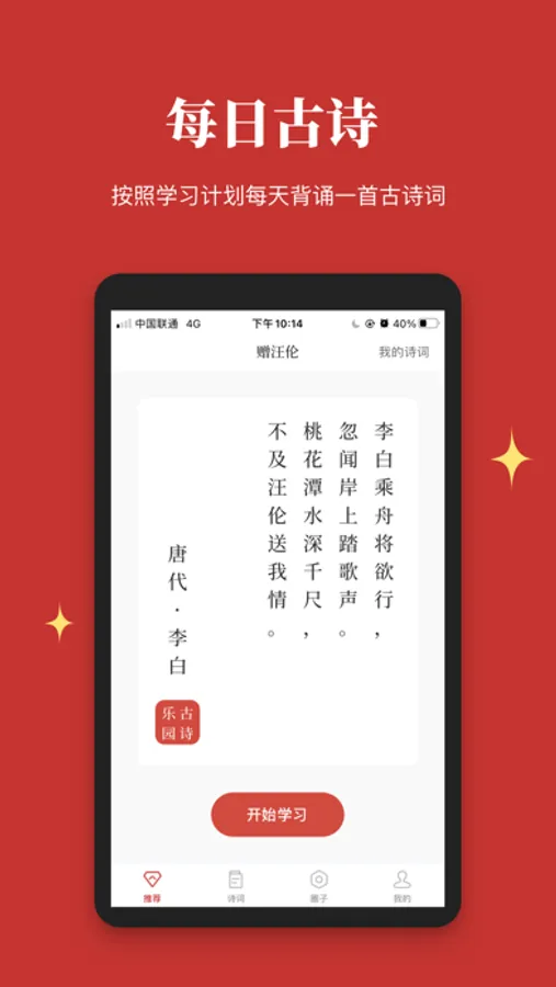 古诗乐园使用趣味答题的方式,让孩子在游戏中,背古诗,学诗词。