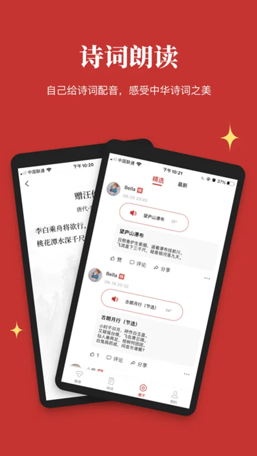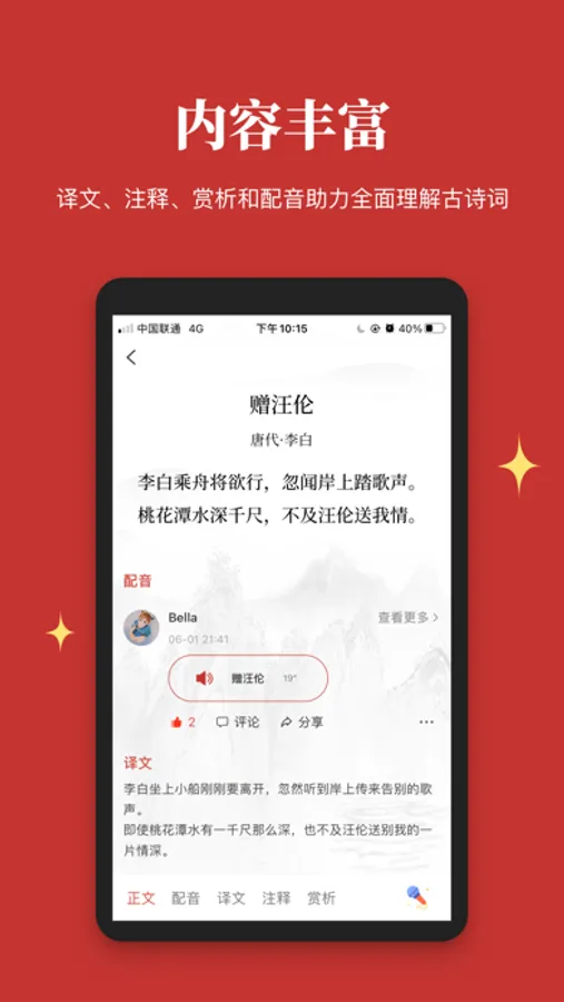 语音评测 - 让孩子的大胆开口读古诗,通过反复学习打分,纠正孩子的发音、通过每一次的打分,看到孩子的一次次进步。