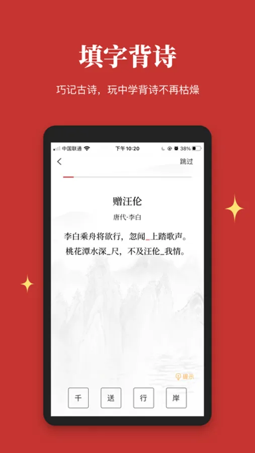 趣味背诗 - 通过趣味答题的方式,让孩子在欢乐中背会古诗词。