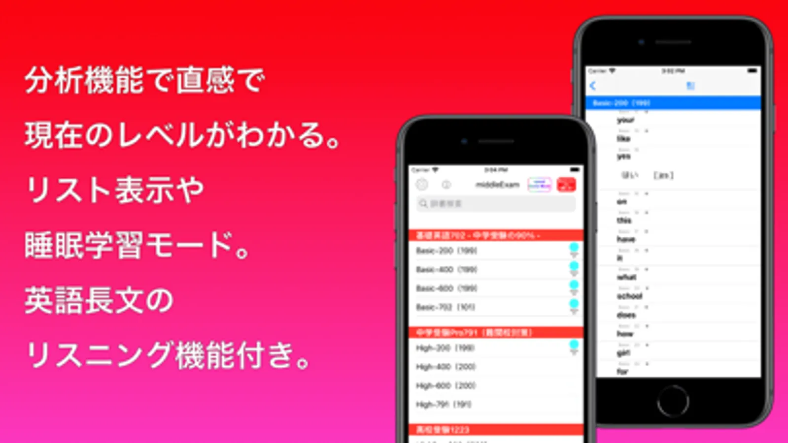 隙間時間にサクッとできるようアプリ設計を行っています。覚えたリストや、分析グラフで、進行具合を把握することができます。ゲームモードやリスニングモード、リストモードを追加し、スピード感を持って、英単語を覚えることができます。