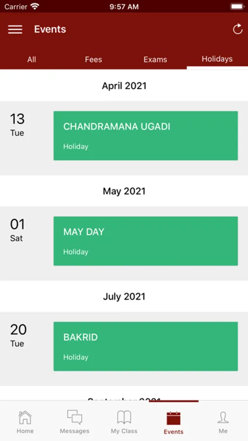 Events : All the events such as Exams, Parents-Teachers meet, Holidays and Fee due dates will be listed in the institution calendar. You will be reminded promptly before important events. Our handy holidays list will help you plan your days in advance.