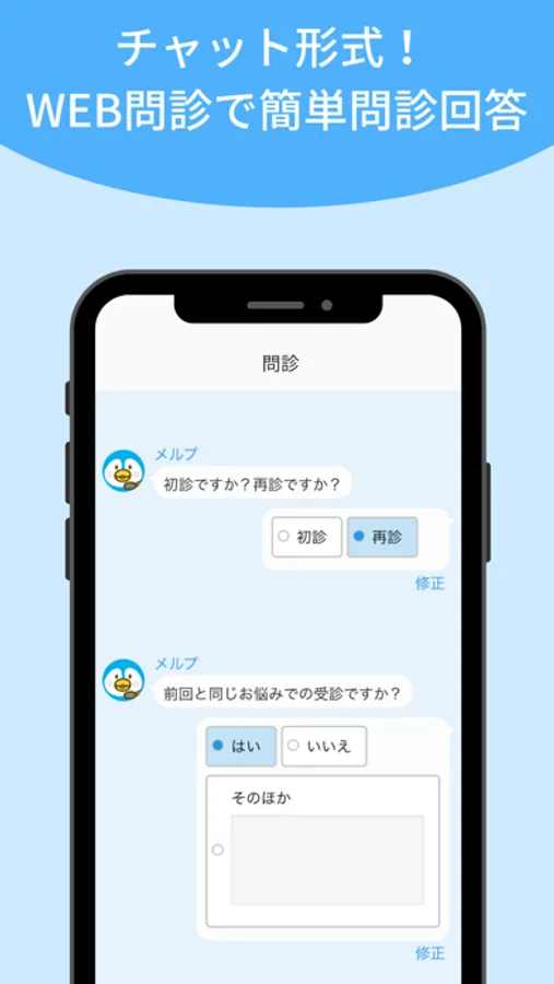 メルプは、メルプWEB問診対応のクリニックの問診回答を、アプリから行うことができる「かかりつけ医アプリ」です。