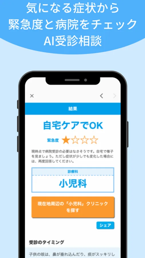 また、症状から診療科と緊急度を1分でチェックできる「メルプAI受診相談」も提供しています。