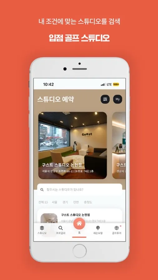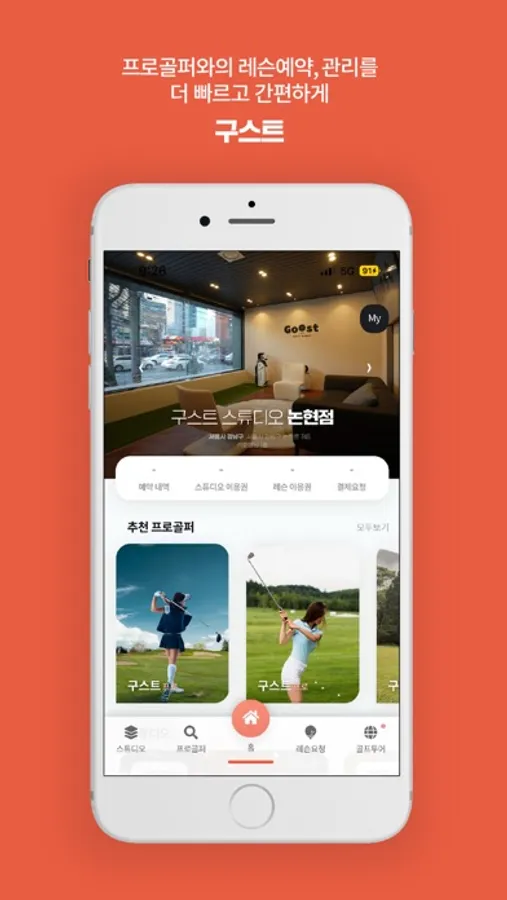 구스트(GOOST)는 골프레슨 / 스튜디오 예약 플랫폼으로써 당신이 원하는 날짜와 시간에 가능한 스튜디오와 프로 골퍼 현황을 한 눈에 확인할 수 있고 이용권 구매를 통해 손쉽게 예약이 가능한 플랫폼입니다.