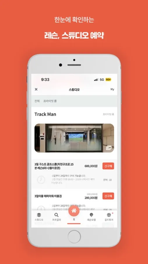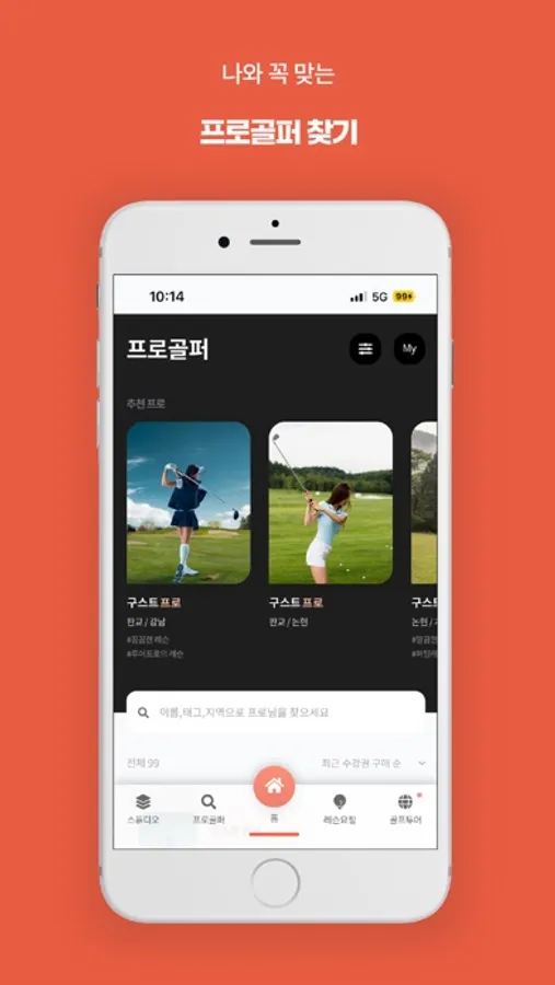 - 구스트에 등록되어 있는 프로 골퍼들을 확인하고 본인에게 맞는 프로의 레슨권을 구매하여 예약을 진행할 수 있습니다.