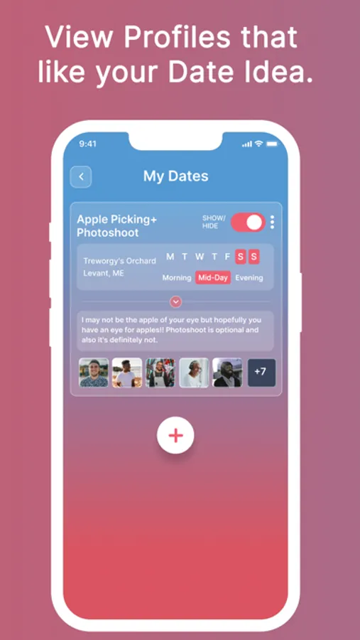 Matching with others can be done in two ways. The first method is to like profiles that are interested in your date idea. They will be able to see your profile in reference to the date and like you back to match.
