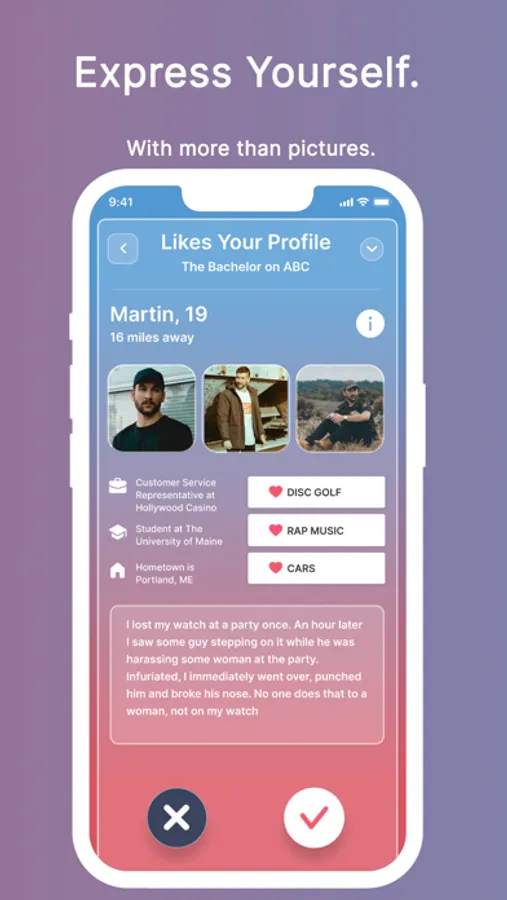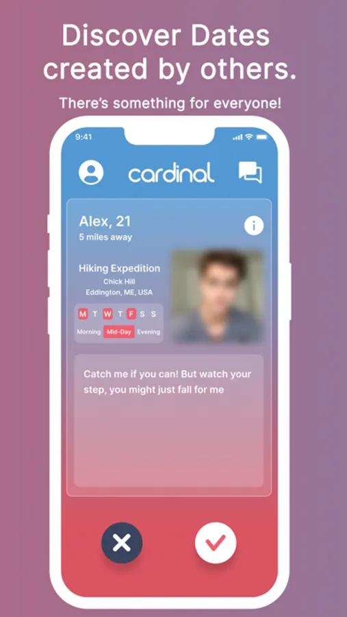 Date ideas are your first point of contact on Cardinal. Sharing what you like to do is a great way to meet people who have similar interests. Consider your ideal first date: a walk around the park, a wine tasting, a classic dinner and movie, or a relaxing night in with a board game. Only your imagination limits the possibilities. When others see your date tile, keep in mind that your profile is hidden, so it's a completely judgement-free zone. We still feel that physical attraction plays a role in overall compatibility, but we treat it as a secondary step in the matching process to encourage users to take a chance and accept people for who they are.