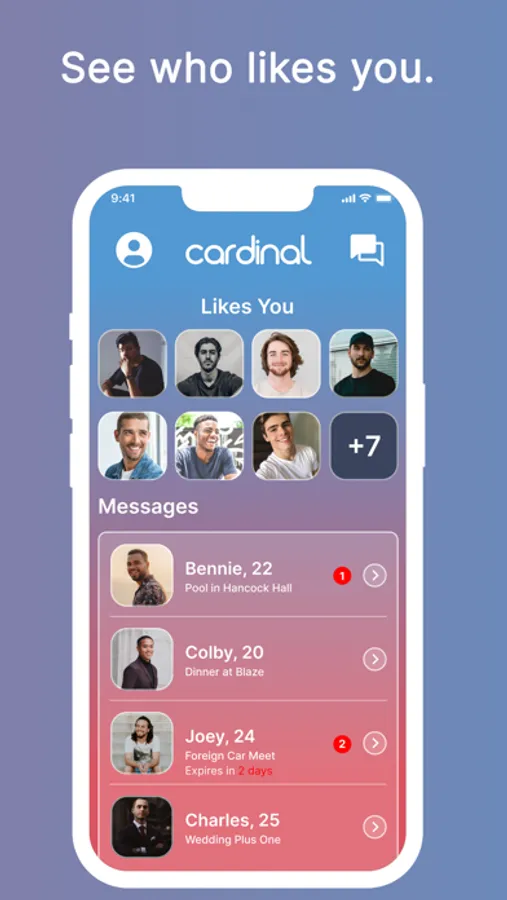 The option to view who likes your date and profile is included in all free accounts. We believe that this removes a lot of the guesswork in matching and allows you to discover what you're searching for more quickly! Cardinal will always make this feature available for free because you deserve complete control over your matches.