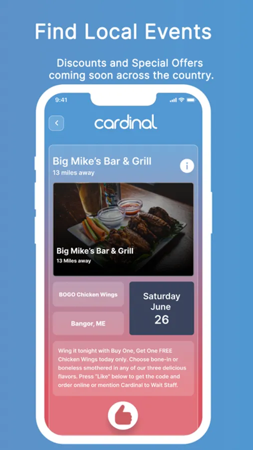 As more people in your area start using Cardinal, we'll reach out to community partners to promote local events and provide discounts and special offers to popular date spots.