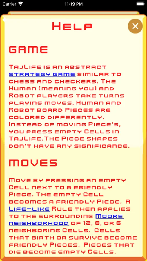 TajLife is a simple colorful musical animated board game. Human and Robot players take turns playing. The goal is to capture and surround your opponent's Pieces which are gems and sultans. TafLife is a customizable game inspired partly by Conway's game of Life .