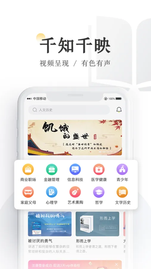 千知千映APP是专注于做线上知识服务的数字产品,大量课程内容均以视频的方式呈现,课程涵盖:商业、文学、历史、科技、心理、艺术、哲学等等,旨在通过精而美的视频课程,给用户带来更为具体、更为形象、更为丰富、更为全面的知识体系,让用户在更符合当下新互联网时代的信息交互与知识获取的场景中,最高效的接触到人类文明发展过程中的种种精髓,能以往昔为借鉴,以文化为底蕴,把未来的路走的更好。