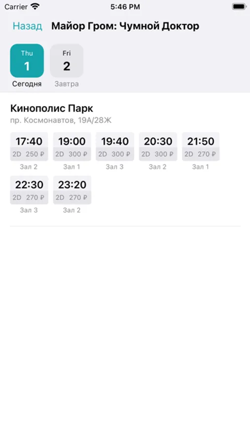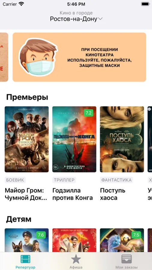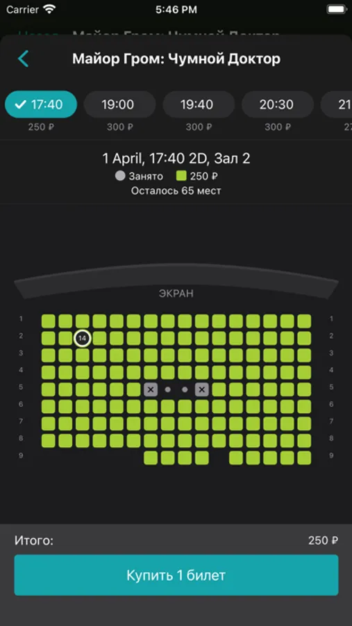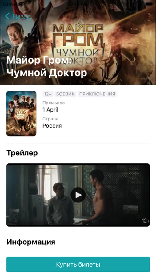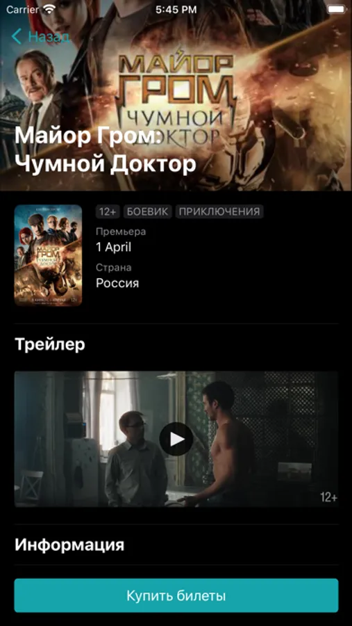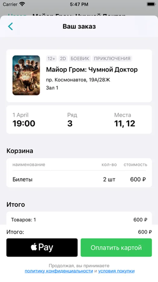 Покупайте билеты с помощью банковской карты или Apple Pay в кинотеатры сети в разных городах России. Покупка доступна в любое время в любой точке города. Вы можете выбирать билеты на сеанс, находясь в кафе, спортзале или общественном транспорте.