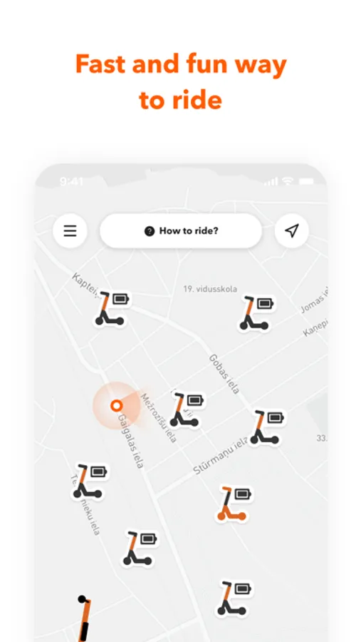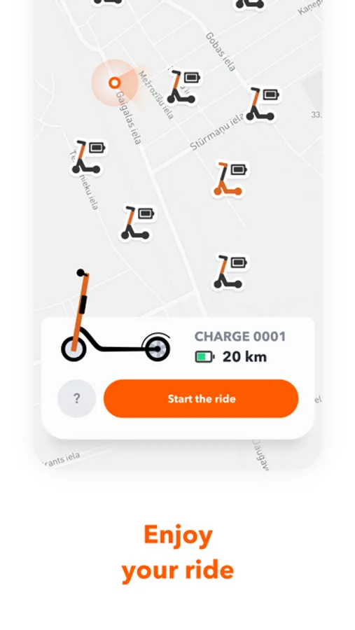 2. Atrodi sev tuvāko CHARGE elektrisko skrejriteni aplikācijā redzamajā kartē. Tu vari