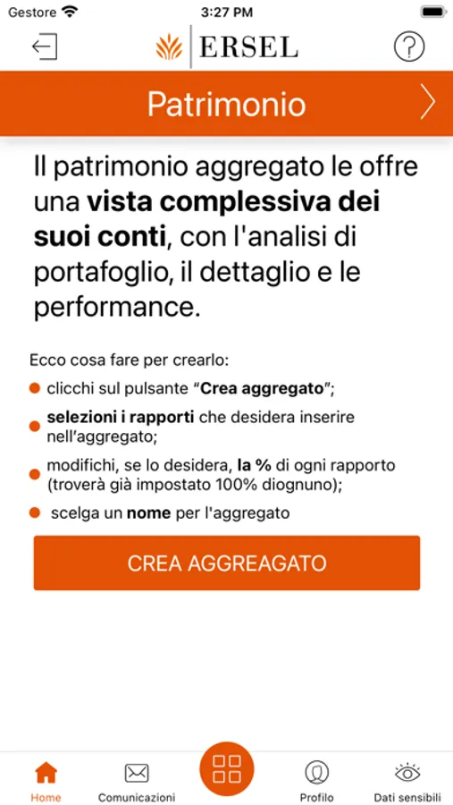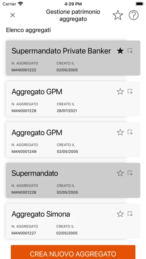 Nella sezione «Gestione Patrimonio Aggregato» può creare un nuovo aggregato e definire il patrimonio aggregato preferito, che sarà visibile sulla home page dell'app. Può inoltre modificare un aggregato già creato oppure eliminarlo. Infine, in questa sezione può visualizzare eventuali viste aggregate create per lei dal suo private banker di riferimento, che non saranno però modificabili.