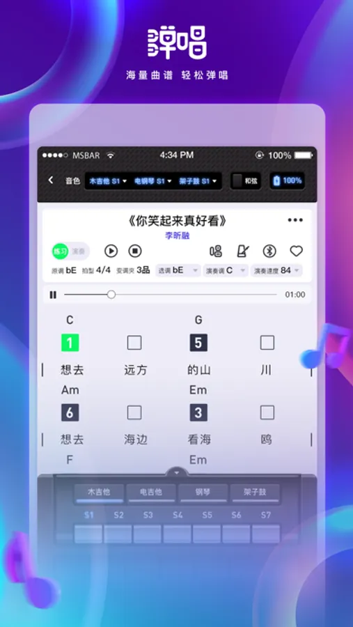 【靠谱】首创弹唱新玩法,迎合不同年龄段、不同乐器掌握程度用户,不懂乐器也能自弹自唱,通过不断练习你也会成为乐器大神。