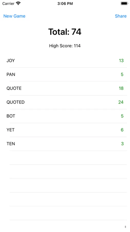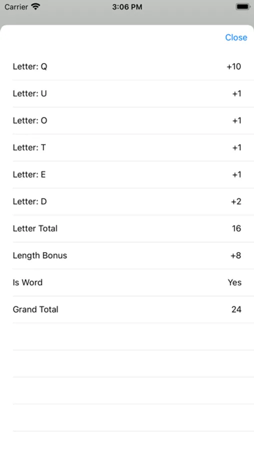 Each letter has a point value and each word is scored by summing the value of each letter. Extra points are awarded for longer words (4 letters and over). Invalid or misspelled words will subtract from your total.