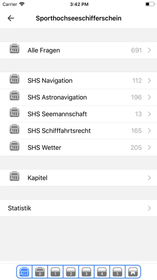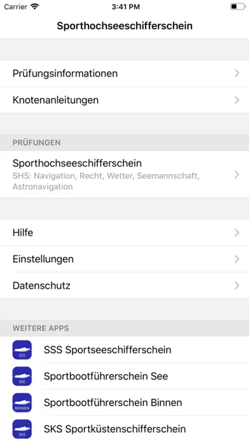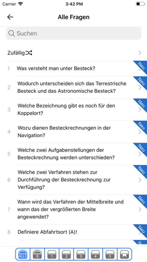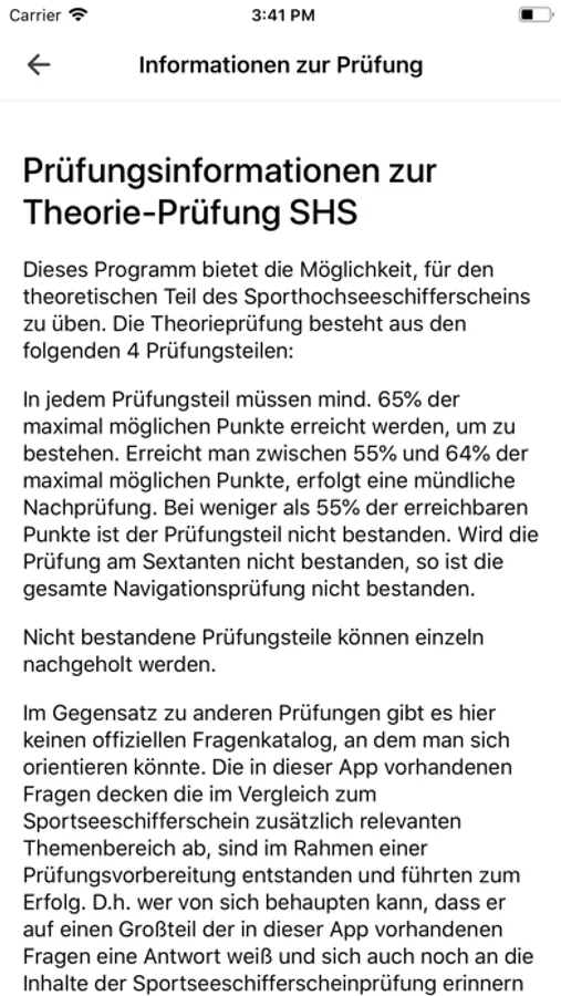 Im Gegensatz zu anderen Prüfungen gibt es hier keinen offiziellen Fragenkatalog, an dem man sich orientieren könnte. Die in dieser App vorhandenen Fragen decken die im Vergleich zum Sportseeschifferschein zusätzlich relevanten Themenbereich ab, sind im Rahmen einer Prüfungsvorbereitung entstanden und führten zum Erfolg. D.h. wer von sich behaupten kann, dass er auf einen Großteil der in dieser App vorhandenen Fragen eine Antwort weiß und sich auch noch an die Inhalte der Sportseeschifferscheinprüfung erinnern kann, sollte den Fragenteil der Prüfungsteile gut bestehen. Im Bereich der Navigation ist zusätzlich zu den Fragen auch eine recht umfassende Navigationsaufgabe zu lösen, auf die die App leider nicht vorbereiten kann.