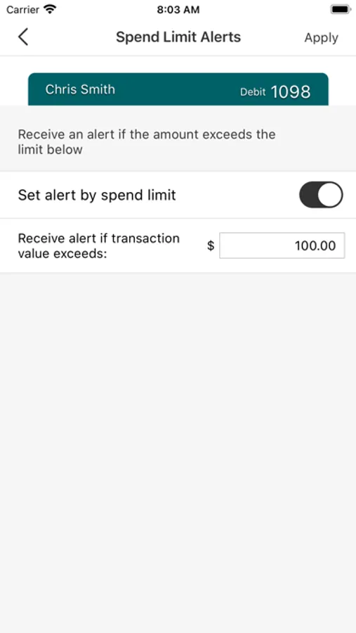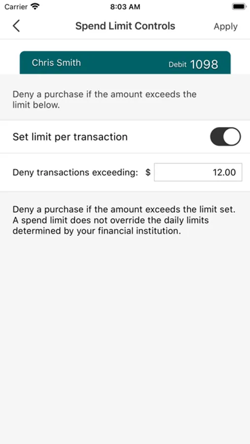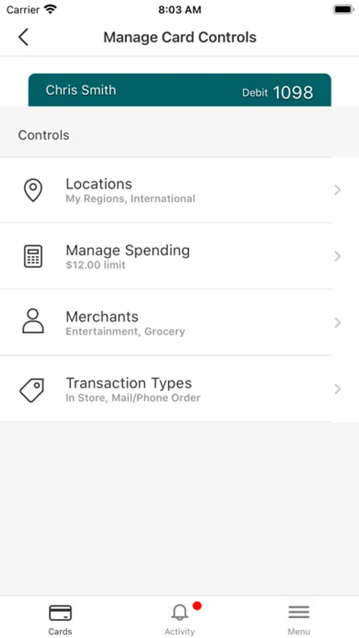 Spending limits can be established to allow transactions up to a certain dollar value and decline transactions when amounts exceed your defined thresholds. Transactions can be monitored and managed for specific merchant categories such as gas stations, department stores, restaurants entertainment, travel, and groceries. And your transactions can also be monitored for specific transaction types: in-store purchases, e-commerce transactions, mail/phone orders and ATM transactions.