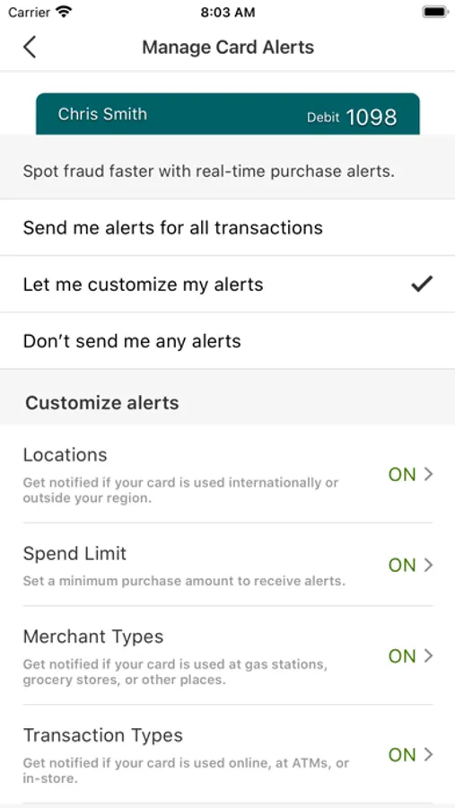 Alerts for PIN and signature transactions can be set up to keep you informed of your debit and credit card usage and help you quickly detect unauthorized or fraudulent activity. This app can send an alert when a card is used or when a card transaction has been attempted but is declined – and additional customizable alert options are available. Alerts are sent in real time, immediately after a transaction has taken place.