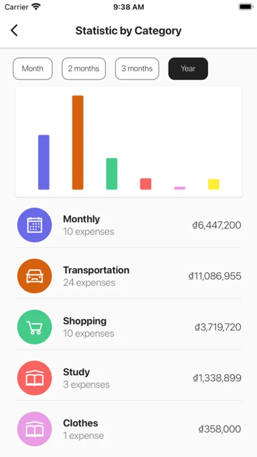 - Statistics of expenses by chart, by day, month in years, it is easily to compare the amount between months.