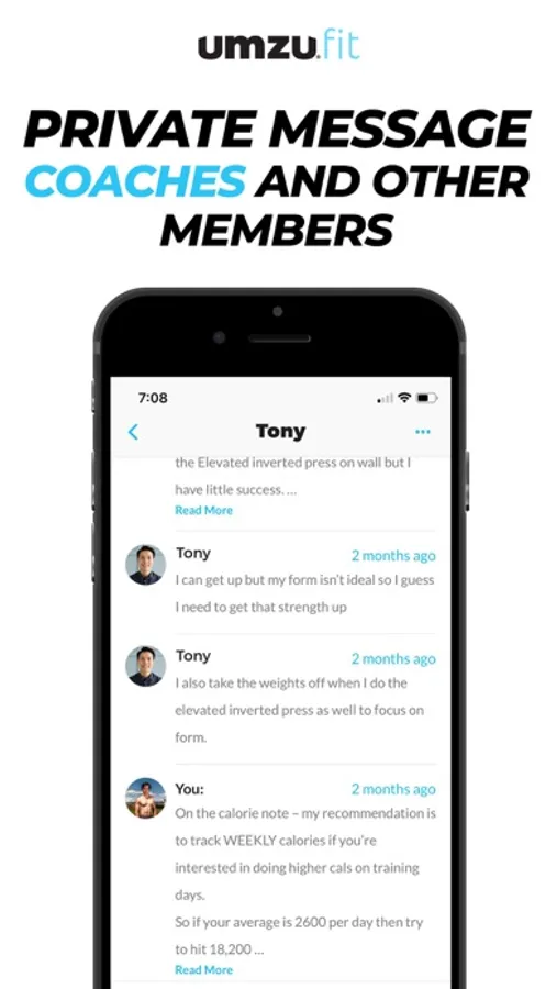 In addition, subscribers get access to a private social network of other subscribers. Ask questions and get answers from peers in the "Activity Feed" or private message our UMZUfit coaches directly, all from inside the UMZUfit app.