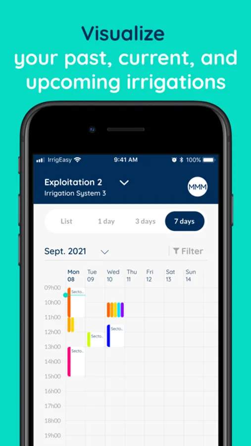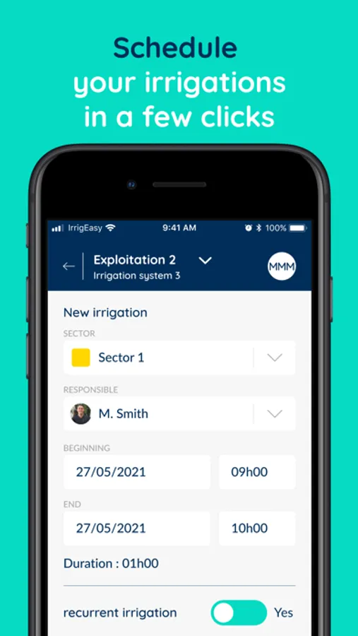 - The app allows you to make irrigation schedules in a few clicks: your sectors are configured, you just have to enter the date, duration, frequency, the person in charge, and voilà Irrigation managers are automatically informed of the schedule to be followed by sector.