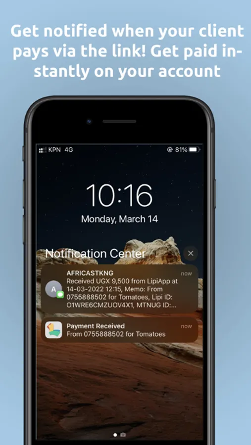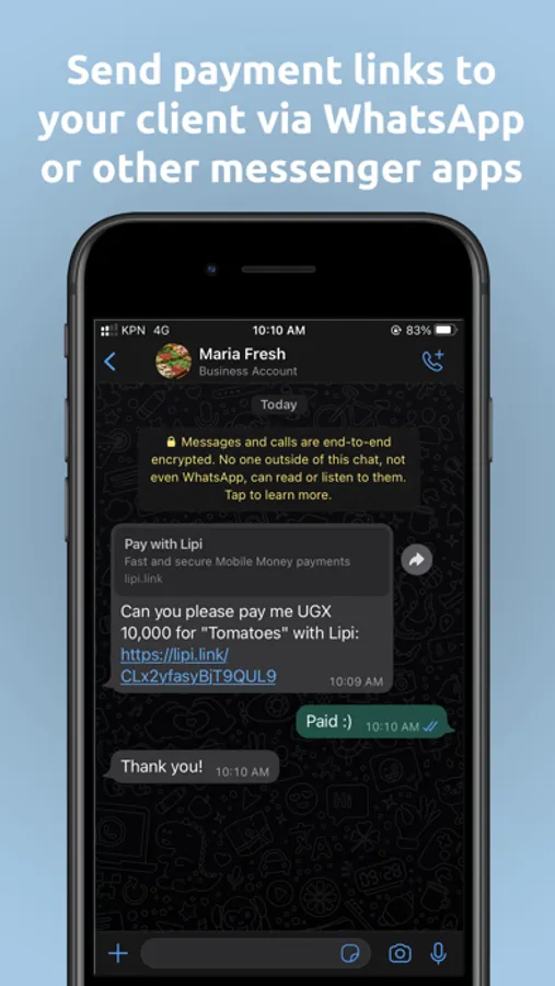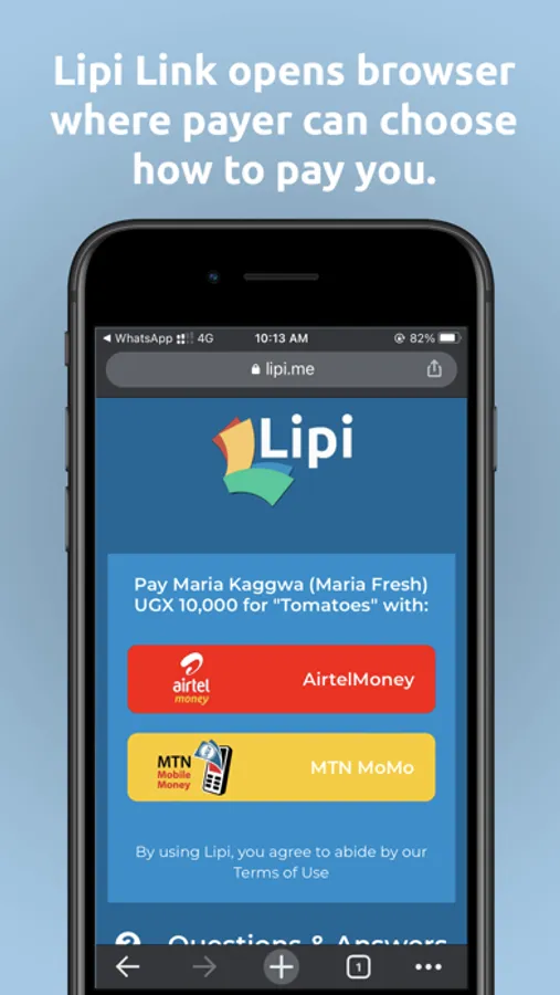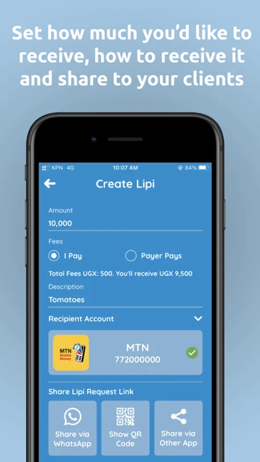 With Lipi, you can also quickly generate a payment link and quickly share it to the sender via WhatsApp, other messaging apps or QR code scan. Simply specify the amount, give a short description like "Gucci Bag" share the payment request link (lipi) and wait for the confirmation that payment has been made! You're paid out instantly to the mobile money account you've chosen. The generated link lets the recipient quickly choose how they want to pay the stated amount. No need to stress your dear sender with recalling and entering phone numbers or spending so much time on USSD and other methods that are error prone and repetitive.