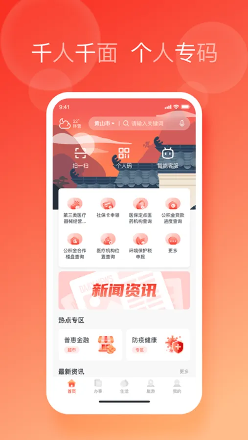 慧黄山APP聚焦“利企便民”,定位城市服务,突出黄山特色,构建集政务类、便民类、旅游类等多元服务为一体的综合服务APP。与皖事通APP错位发展,发挥自身特色,在设计上融合黄山人文风貌,在内容上根据生命周期梳理高频事项,在功能上多措并举推动慧黄山APP成为百姓“能用、易用、爱用”的服务软件。