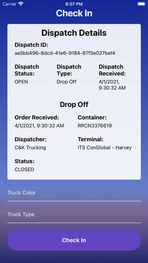 The Envase Precheck app allows drivers to view their dispatch details when checking into a terminal. The app allows them to notify the terminal on their arrival, and navigate to the appropriate container themselves.