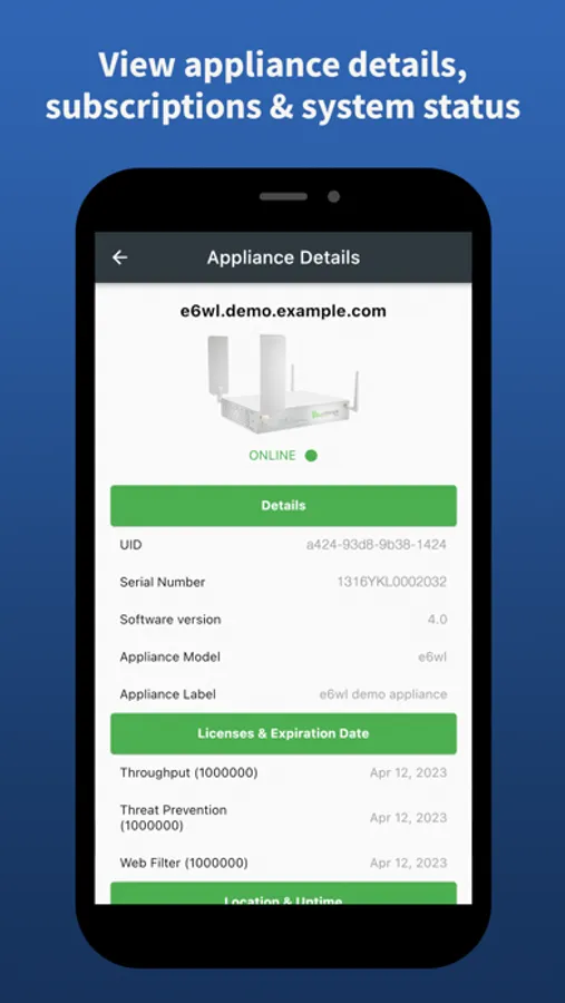 - Review appliance specific information including software version, license, location, system resources and uptime details.