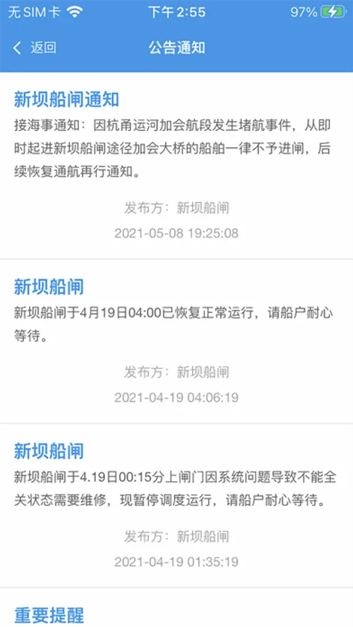 浙闸通APP是一款用于浙江省内船舶过闸的手机过闸APP。其主要功能包括过闸申报、远程缴费、排队查询、通行记录查询、拍照上传、船闸营运信息查询、诚信查询、公告通知等。目前适用地区:杭州、金华、衢州、绍兴、宁波所有船闸。