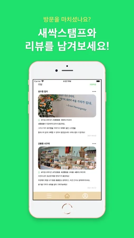 방문하신 매장에 리뷰를 작성하고, 새싹스탬프로 친환경 스토어를 칭찬하세요!
