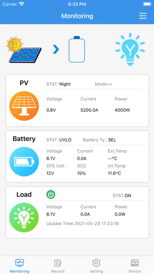 LD iConnect is an solar charge controller monitoring APP software. LD iConnect can monitor the solar charge controller by connecting wireless module(WIFI or Bluetooth). Users can obtain work information, historical data, equipment parameters, information of PV system and set device parameters.