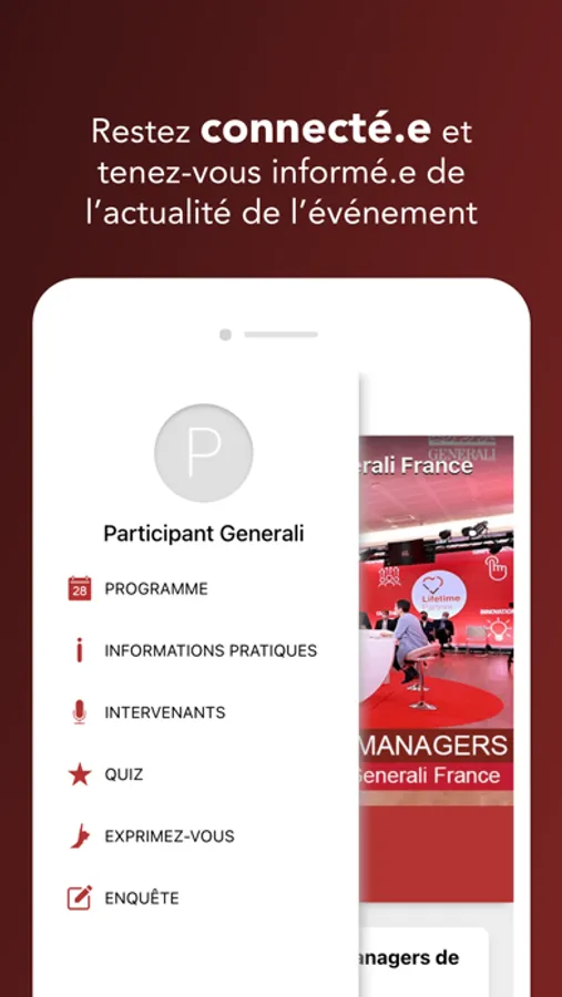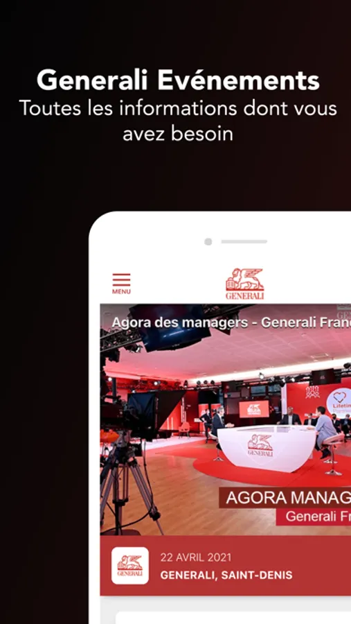 Vous touverez dans notre application, l'ensemble des services digitaux proposés lors des événements organisés par Generali France. Cette application vous permettra avant, pendant et après l'événement de consulter toutes les informations pratiques (programme, informations générales, dress code) ainsi que de poser vos questions aux intervenants . Téléchargez dès maintenant l'application Generali Evénements !