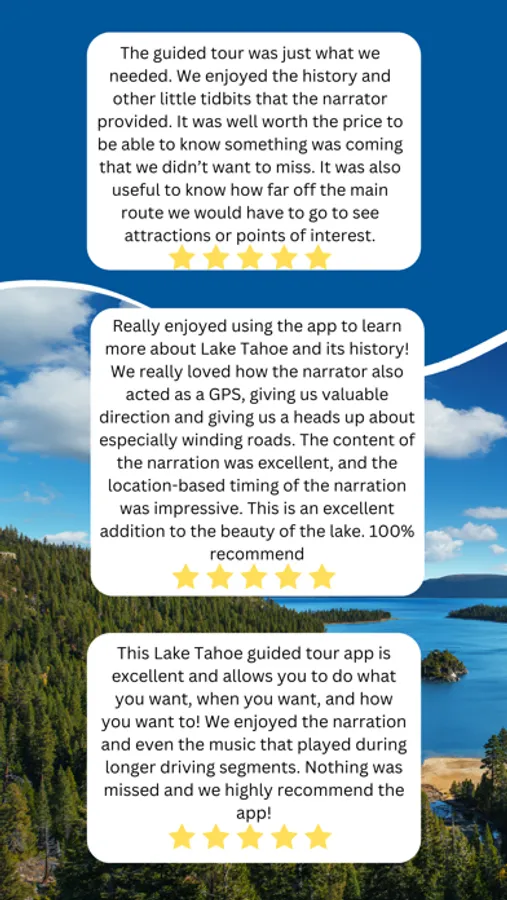 Welcome to the narrated driving tour of Lake Tahoe and find out why the dazzlingly blue waters of Lake Tahoe have been named America’s most beautiful lake! Start and stop the tour whenever you like, and explore Tahoe at your own pace.