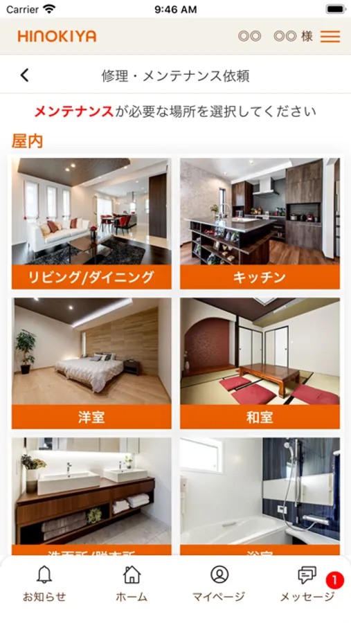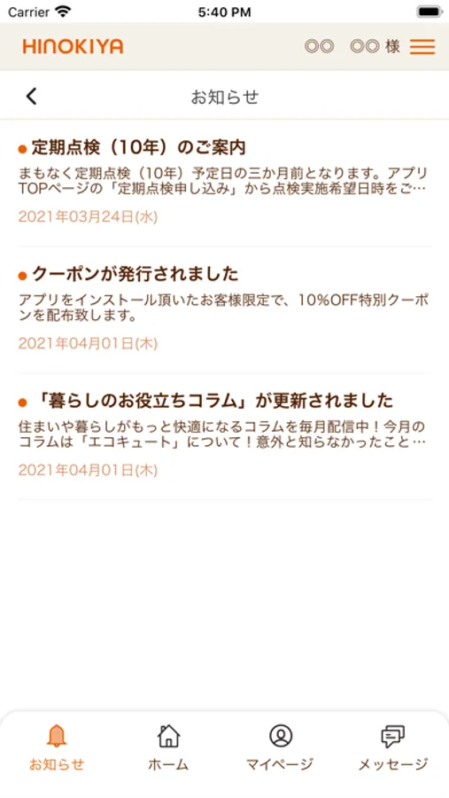お客様ごとの住宅情報の確認や、ヒノキヤグループからのお知らせ、リフォーム事例や困ったときのQ&Aを閲覧できます。