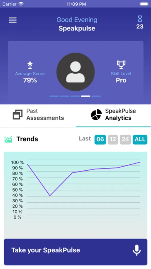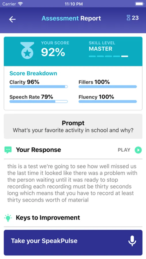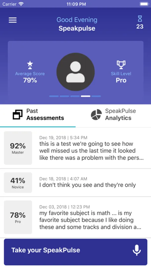 Using the app’s proprietary algorithm, Entity Academy analyzes an individual’s sample audio recording, and provides a composite score based on the individual’s speaking level. The score is based on key variables, such as the number of filler words, disfluencies or repetitions that are identified during a sample recording.