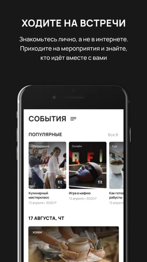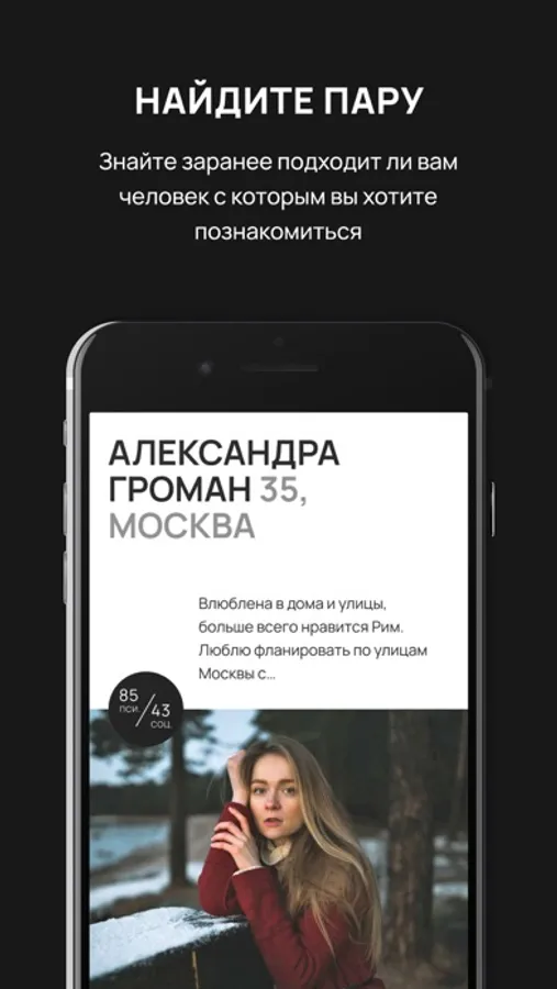 Любое знакомство происходит исключительно оффлайн в Москве, а рекомендации в приложении научно обоснованы. Здесь у вас не будет бесконечных анкет и свайпов: выбираете мероприятие, знакомитесь вживую и только потом отмечаете с кем хотите продолжить общение.