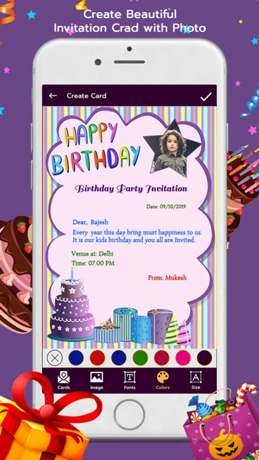 You can customize Birthday Invites card with different color option, change message color and size, apply different font size etc.