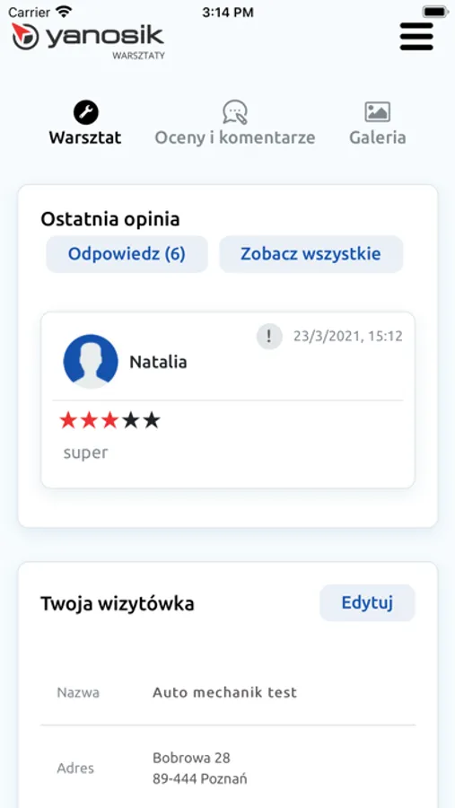 Aplikacja przeznaczona jest dla mechaników posiadających wizytówkę swojego warsztatu na portalu yanosik.warsztaty.pl. Dzięki niej zyskasz kontrolę nad wizerunkiem Twojego serwisu w aplikacji Yanosik oraz na portalu, w tym możliwość: